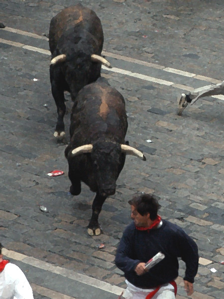 El Encierro, the running of the bulls, happens each day at 08:00 beginning on the morning of July 7th, when six fighting bulls accompanied by six large steers race along Pamplona's narrow streets after beging released from their corral on Calle Santo Domingo.